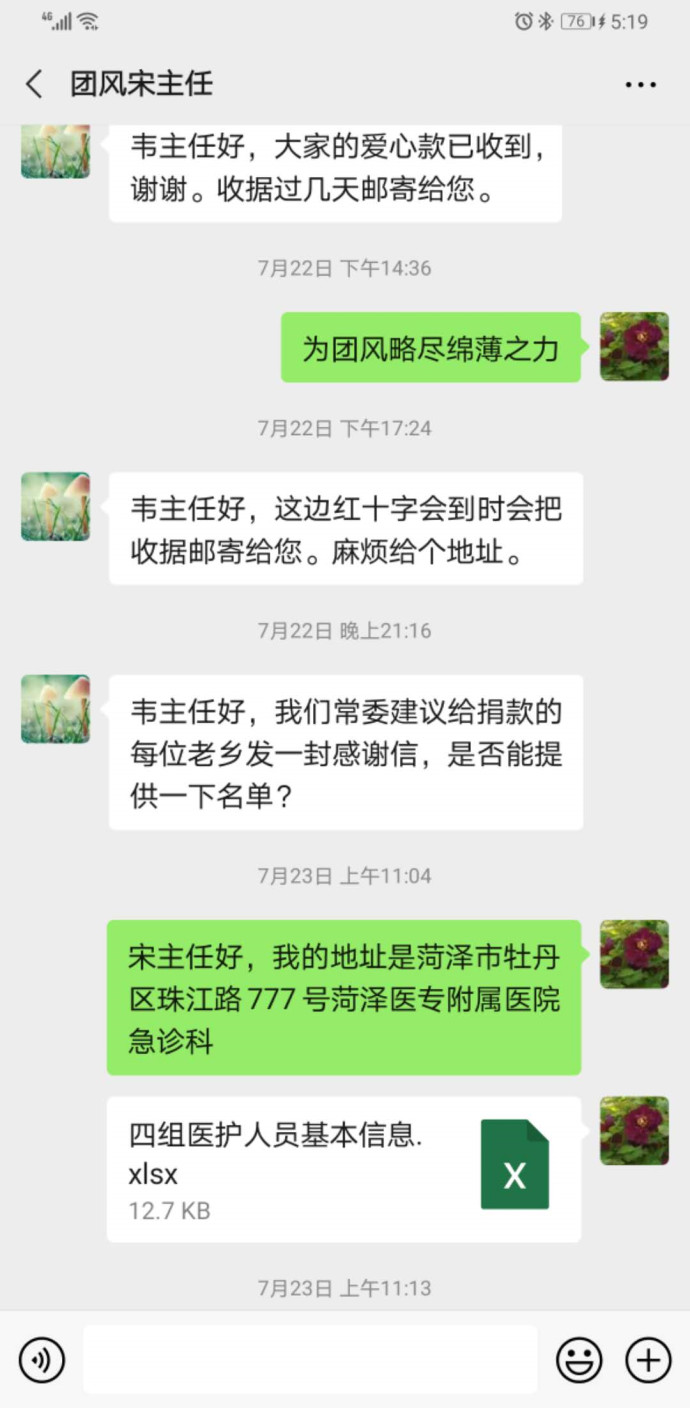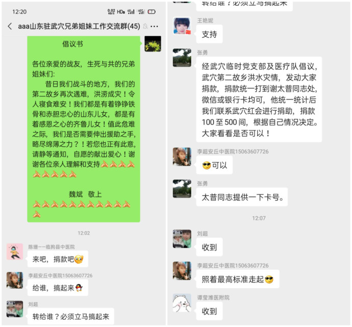 發(fā)至“山東駐武穴兄弟姐妹工作交流群”,大家一呼百應(yīng),群起而捐款之,同樣受災(zāi)嚴(yán)重的武穴市人民,也感受到來自“最美逆行者”的熱情,以及山東人民的熱心。