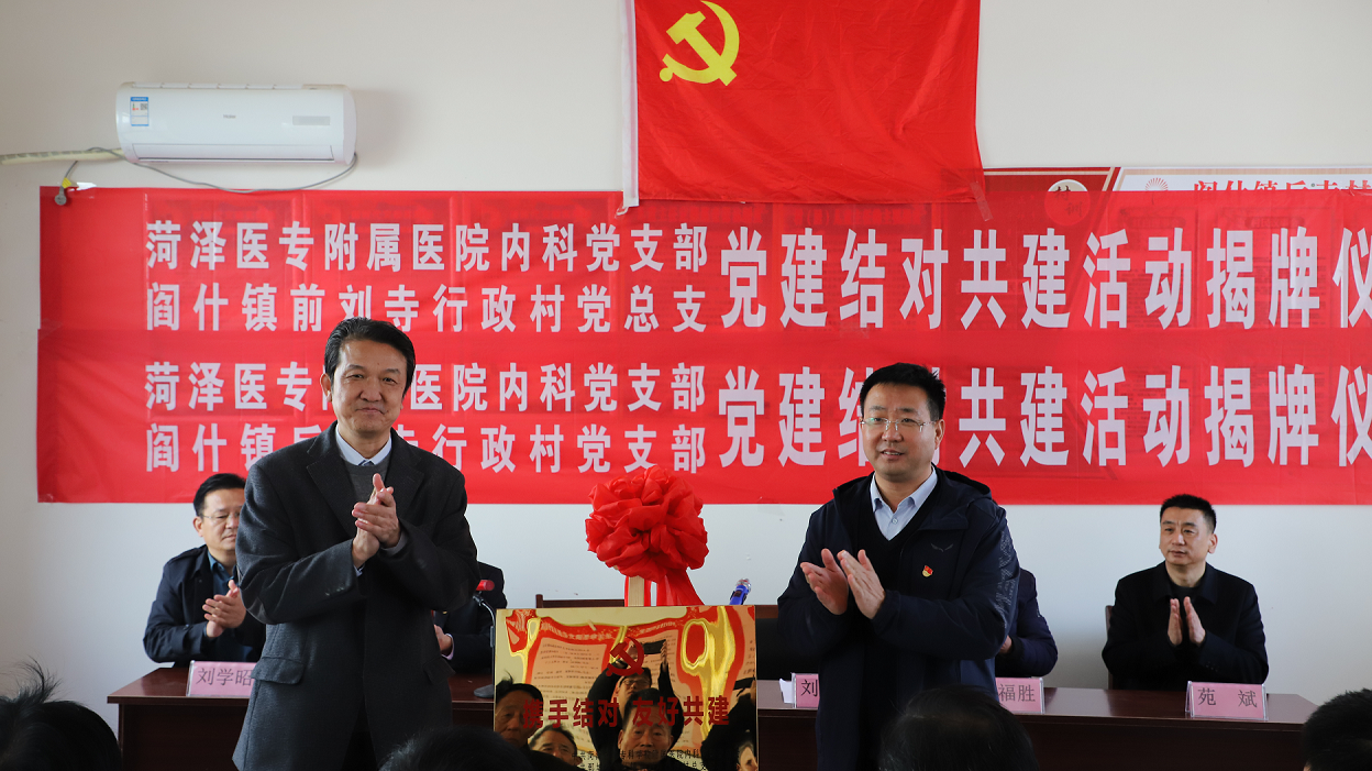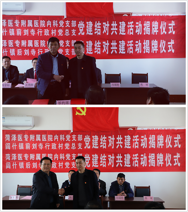 菏澤醫(yī)專附屬醫(yī)院內科黨支部書記苑斌同志分別與閻什鎮(zhèn)前劉寺行政村黨總支書記劉福勝同志、閻什鎮(zhèn)后劉寺行政村黨支部書記劉學昭同志簽署了《黨支部結對共建協(xié)議書》。