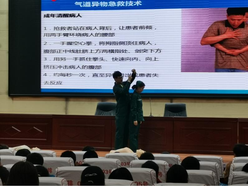 此次活動約有300余師生參加,極大的調(diào)動了師生參與急救知識和操作培訓(xùn)的積極性。急診科韋福利主任親臨現(xiàn)場,生動形象的分步講解了心肺復(fù)蘇的操作流程及注意要點;李霞護(hù)士長講解并示范了氣道異物的急救手法,現(xiàn)場掌聲連連。