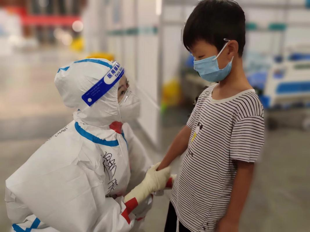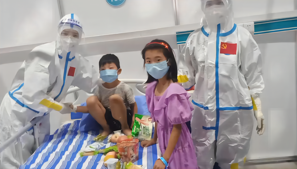 方艙醫(yī)院是社會(huì)的微縮景象,這里雖有焦慮不安,恐懼擔(dān)憂,更有溫情脈脈、守望相助、無私奉獻(xiàn)。艙內(nèi)患者下至一歲孩童,上至七八十歲的老人,細(xì)心的穆君蕊在工作中得知名叫“棟棟”的6歲小男孩和另一個(gè)叫“婷婷”的9歲小女孩,分別來自兩個(gè)家庭,孤身一人被隔離到方艙,對陌生的環(huán)境充滿了恐懼。穆君蕊家里也有孩子,看得出她對孩子的心疼,即便在口罩、防護(hù)服、護(hù)目鏡的包裹之下,可以隱約看到穆君蕊已經(jīng)濕潤的眼眶。