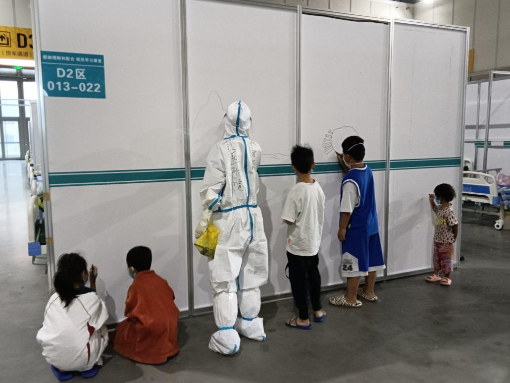 工作緊張忙碌,在方艙醫(yī)院主要是無癥狀感染者和輕癥患者,要對患者做好生活和心理上的關(guān)懷、疏導(dǎo),尤其是引導(dǎo)患者疏解緊張、急躁情緒。方艙內(nèi)有不少孩童,穆君蕊和李麗在完成工作任務(wù)之余會(huì)帶領(lǐng)棟棟、婷婷及其他孩子們一起繪畫,以緩解不安情緒。孩子們最喜歡畫的形象是“大白”和家園,經(jīng)過簡單的指導(dǎo),孩子們所畫的“大白”立馬傳神了很多。有不少患者拍下自己和孩子畫畫的照片或視頻,通過手機(jī)發(fā)給家人,報(bào)了平安,消除艙外家人的擔(dān)憂。