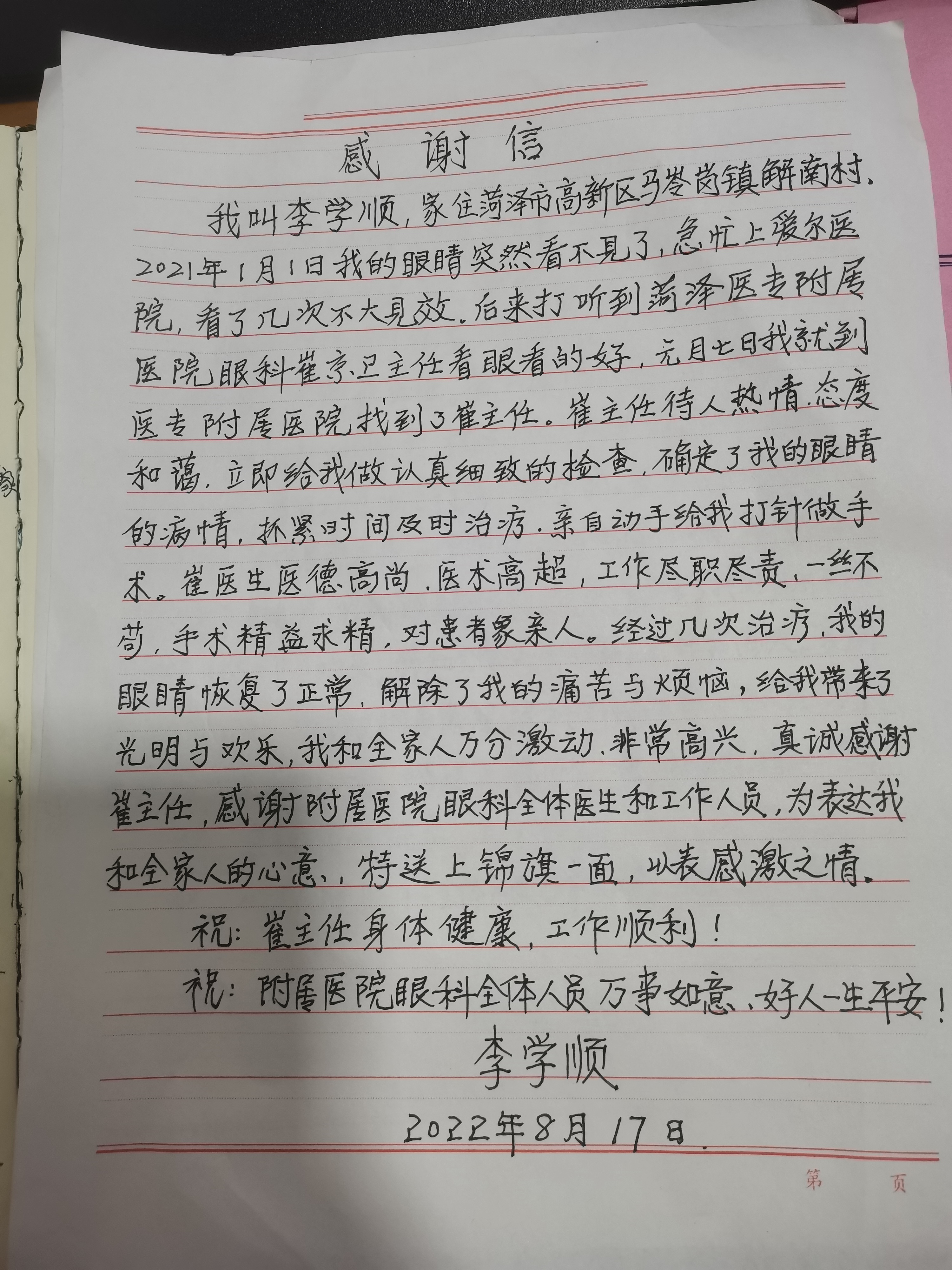 “醫(yī)德雙馨,精益求精,認真負責,手到病除”這是菏澤市高新區(qū)馬嶺崗鎮(zhèn)的患者李某某對菏澤醫(yī)專附屬醫(yī)院眼科副主任崔京衛(wèi)的評價?;颊咄蝗灰曃锊灰?,生活受限,四處求醫(yī)未見好轉,經(jīng)菏澤醫(yī)專附屬醫(yī)院眼科崔京衛(wèi)診治后,患者視力明顯提高,個人生活完全自理,患者及家屬十分感動,對崔醫(yī)師的精湛醫(yī)術及工作態(tài)度高度贊揚,特意書寫自己的心聲,向崔醫(yī)師表示感謝。