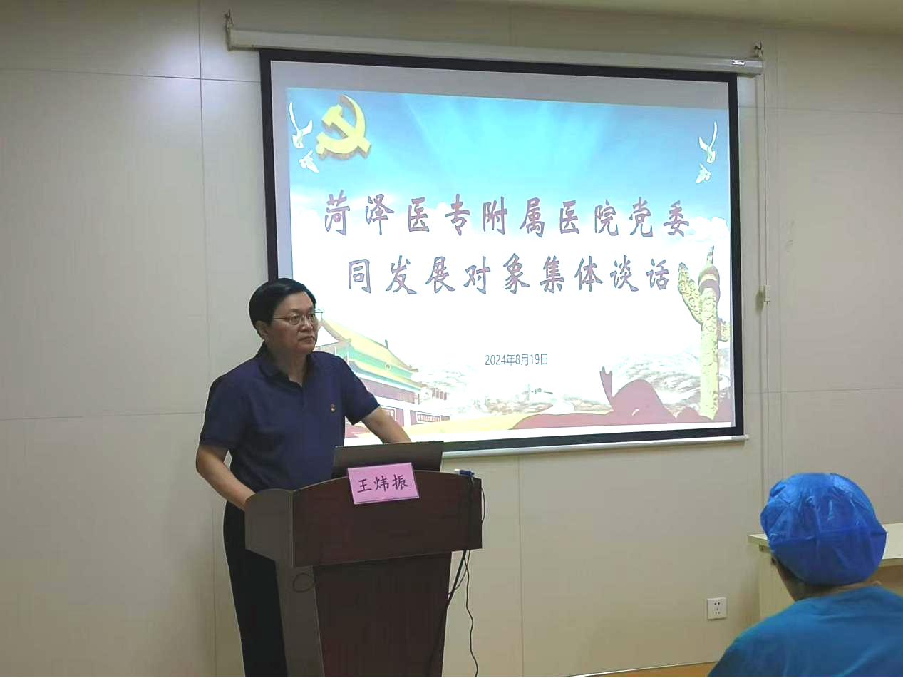菏澤醫(yī)專附屬醫(yī)院黨委高度重視黨員發(fā)展工作,為了進(jìn)一步做好這項(xiàng)工作,提高發(fā)展對(duì)象的入黨動(dòng)機(jī)、黨性修養(yǎng)和政治素養(yǎng),確保黨員隊(duì)伍的純潔性和先進(jìn)性,8月19日,醫(yī)院黨委副書記王煒振對(duì)黨員發(fā)展對(duì)象進(jìn)行了集體談話。此次談話旨在嚴(yán)把黨員發(fā)展“入口關(guān)”和“質(zhì)量關(guān)”,為黨的事業(yè)培養(yǎng)更多優(yōu)秀人才。