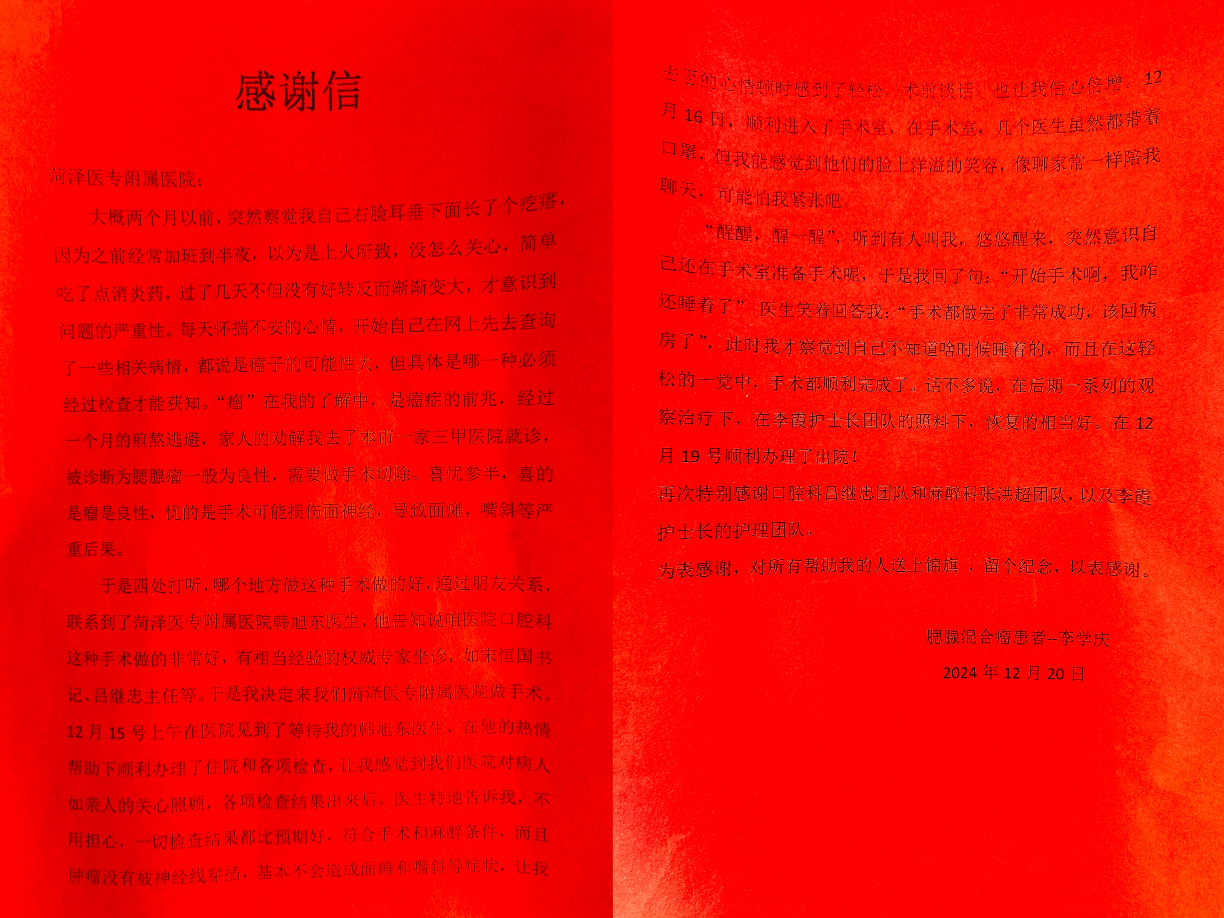 經(jīng)四處打聽,通過朋友關(guān)系,聯(lián)系到了菏澤醫(yī)專附屬醫(yī)院韓旭東醫(yī)生,得知菏澤醫(yī)專附屬醫(yī)院口腔科擅長做這種手術(shù),有很多經(jīng)驗(yàn)豐富的權(quán)威專家坐診。于是便決定來菏澤醫(yī)專附屬醫(yī)院做手術(shù)。口腔科門診以“腮腺區(qū)腫物”于12月15日收入院,完善各項(xiàng)輔助檢查后,于12月16日上午9:30在手術(shù)室全麻下,行“腮腺病損切除術(shù)+面神經(jīng)解剖術(shù)”。手術(shù)非常順利,術(shù)后恢復(fù)良好,不會(huì)出現(xiàn)李先生擔(dān)心的面癱、嘴斜等癥狀。于19日繼續(xù)加壓包扎出院。出院第二天給予隨訪,提醒其注意加強(qiáng)營養(yǎng),清淡飲食。