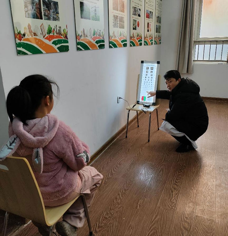 當(dāng)日上午,眼科黨支部書記王偉偉和路博同志攜帶專業(yè)眼科檢查設(shè)備,驅(qū)車前往定陶區(qū)仿山鎮(zhèn)黨委黨校。一到目的地,便迅速搭建起臨時(shí)眼科檢查站,用最專業(yè)的態(tài)度和最溫柔的話語,迎接每一位前來檢查的孩子及家長。從基礎(chǔ)的視力測試到詳細(xì)的眼底檢查,每一步都凝聚著對孩子們健康的深切關(guān)懷。