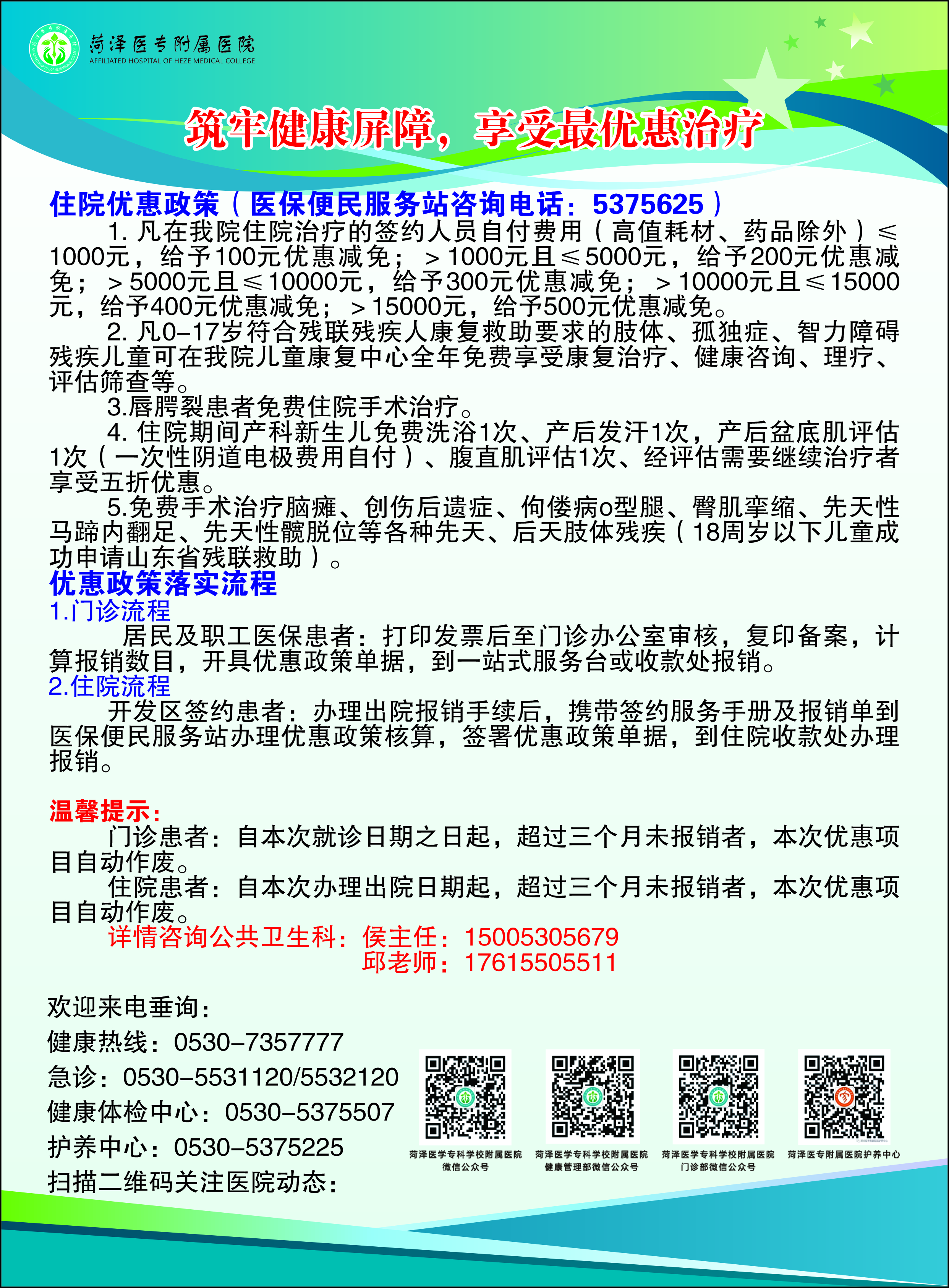 5、凡在我院康復(fù)醫(yī)學(xué)科門診就診的患者,門診康復(fù)費(fèi)用除醫(yī)保政策報(bào)銷費(fèi)用外,個(gè)人自付部分再減免40%。(免費(fèi)項(xiàng)目:蠟療(熱敷)5次、冷敷5次、低頻3次、中頻3次、超短波3次、電動(dòng)起立床3次、紅外線3次、CPM2次、智能上下肢主被動(dòng)訓(xùn)練器2次、天軌2次、懸吊2次、下肢康復(fù)機(jī)器人2次、經(jīng)顱磁2次。)