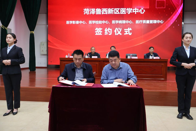 魯西新區(qū)文化衛(wèi)生服務(wù)中心副主任陳廣鋒、菏澤醫(yī)專附屬醫(yī)院副院長(zhǎng)苑斌共同簽署四大醫(yī)學(xué)中心合作協(xié)議。