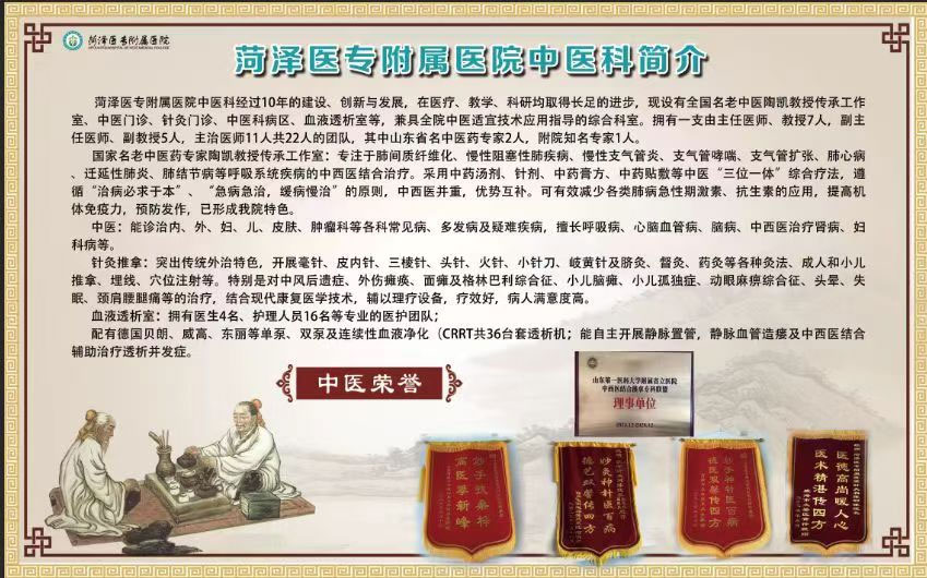 在國家大力發(fā)展中醫(yī)藥的政策指導下,根據(jù)目前醫(yī)院發(fā)展及病人需求,菏澤醫(yī)專附屬醫(yī)院也加大了對中醫(yī)藥發(fā)展的力度。把中醫(yī)科門診、病房進行整合,為中醫(yī)藥發(fā)展騰出空間,改造了一棟獨立的中醫(yī)康復樓。結合醫(yī)院學科建設發(fā)展規(guī)劃成立了中醫(yī)藥工作領導小組,并下設中醫(yī)藥管理辦公室,重點對接中醫(yī)藥發(fā)展相關事宜。大力推進中西醫(yī)協(xié)同發(fā)展充分發(fā)揮中醫(yī)藥在優(yōu)勢病種和優(yōu)勢環(huán)節(jié)上的作用,建立了中西醫(yī)聯(lián)合查房制度,開展中西醫(yī)協(xié)同診療,根據(jù)臨床需求,與中醫(yī)類別醫(yī)師組建多學科診療團隊(MDT)。并充分發(fā)揮其他臨床科室中醫(yī)藥能力,提升醫(yī)院整體服務能力和水平。 醫(yī)院鼓勵和支持開展中醫(yī)藥科學研究,對接國家戰(zhàn)略需求、行業(yè)發(fā)展重點、臨床服務需要,注重研究成果轉化,加快研究成果應用推廣,為中醫(yī)藥科學研究積極創(chuàng)造條件。(供稿:任燕敏)