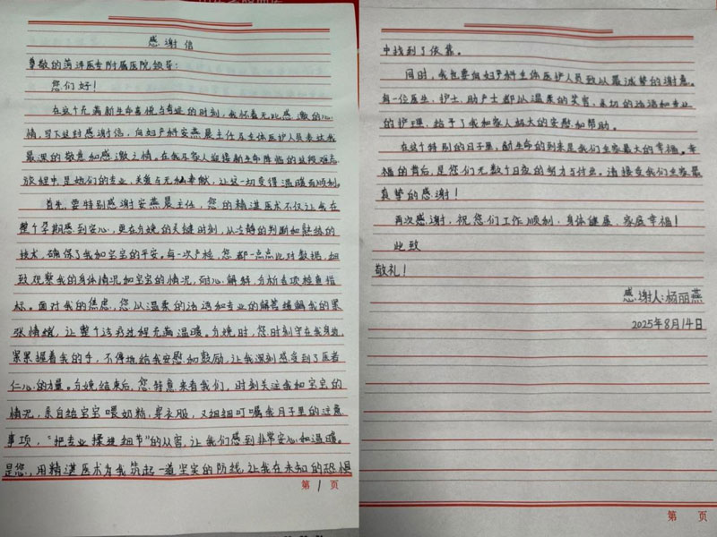 在感謝信中,楊女士動(dòng)情地寫道:“在我最無(wú)助、最害怕的時(shí)候,是你們給了我希望和力量。你們的專業(yè)、關(guān)愛(ài)與無(wú)私奉獻(xiàn),讓這一切變得溫暖而順利?!边@面錦旗和感謝信,不僅是對(duì)婦產(chǎn)科醫(yī)護(hù)團(tuán)隊(duì)的肯定,更是對(duì)他們未來(lái)工作的激勵(lì)。