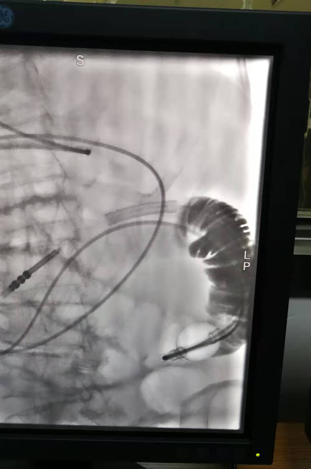 因病情比較危重,腸梗阻時間較長,心肺功能差,為爭取治療時間,劉慶民、趙金旭及ICU副主任魏斌、介入科等人員于11月9日夜間加班為老人進行介入下置管,手術成功完成,為病人贏得了寶貴的治療時間。置管后引流良好,腹脹明顯好轉,第二天透視,液氣平消失,梗阻解除。