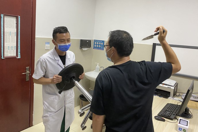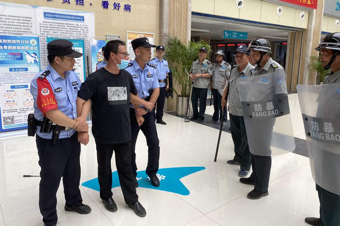 反恐應急演練模擬患者家屬情緒激動,持兇器對值班醫(yī)生進行威脅,醫(yī)生用凳子抵擋。值班護士看到后,立即啟動“一鍵報警”。保衛(wèi)科人員接到“一鍵報警”后,通過對講機通知在崗安保人員做好反恐準備,迅速攜帶安保器械趕至事發(fā)現(xiàn)場。保衛(wèi)科科長孫普向主管院領導匯報后,立即啟動了反恐防暴應急預案,同時向公安機關報警。與攜帶裝備的安保隊員團結協(xié)作,對該男子進行控制。公安機關趕到后,對該男子進行進一步控制,并帶離現(xiàn)場。