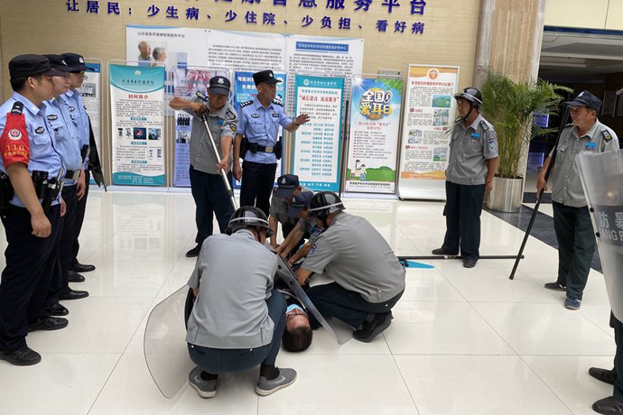 演練結束后,賀萬山警官對演練進行了總結,并指出演練過程中中存在保安人員盾牌握持姿勢、防護角度不到位,鋼叉和警棍使用不靈活,隊員之間配合不默契等問題。菏醫(yī)附院院長助理陳劼表示,反恐防暴工作是醫(yī)院安全工作中重要的組成部分,今后會針對此次演習中的不足之處,定期組織,加強練習,及時完善醫(yī)院應急預案。