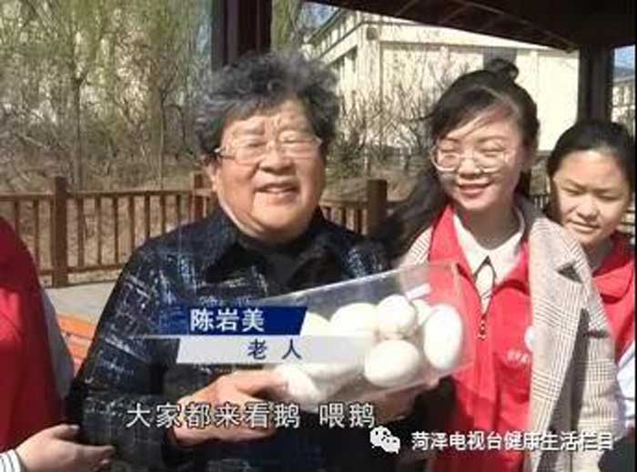 陳巖美老人說,每天業(yè)余時(shí)間,大家都來看鵝,喂鵝,和幾個(gè)老年同志每天都來幾次,三頓飯都拾那個(gè)饃頭,大家吃不完的那個(gè)饃頭,大家拾了來喂鵝。這是收獲,經(jīng)過兩個(gè)多月的喂養(yǎng),現(xiàn)在已經(jīng)下蛋了,已經(jīng)11個(gè)了。很高興。