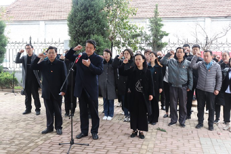 隨后,在劉心臣書記的帶領(lǐng)下,全體人員面對革命烈士紀(jì)念碑,高舉右拳,再次許下莊嚴(yán)而鄭重的誓言:“我志愿加入中國共產(chǎn)黨,擁護(hù)黨的綱領(lǐng),遵守黨的章程……”,鏗鏘誓言,莊嚴(yán)神圣,聲音響徹于心,在陵園內(nèi)久久回蕩。