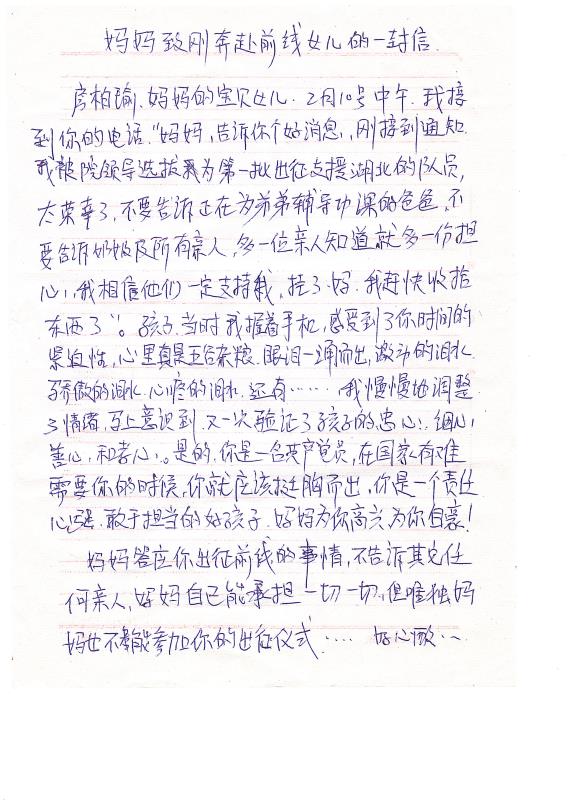孩子,到前線后,可能還會(huì)遇到你預(yù)料不到的困難,但有老師在,有同事在,有大的團(tuán)隊(duì)在,我相信所有的困難你都能克服。媽媽為了保護(hù)家人,為了堅(jiān)守職責(zé),也一直在班上,下班也沒(méi)回家,有事與你爸電話聯(lián)系,你放心一切,望你安心投入戰(zhàn)斗。