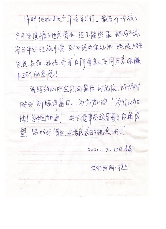 爸媽的心肝寶貝,再最后,你要記住,媽媽時(shí)時(shí)刻刻陪伴著你,為你加油!為武漢加油!為中國(guó)加油!決不能辜負(fù)領(lǐng)導(dǎo)寄予你的厚望,好好珍惜這次成長(zhǎng)的機(jī)會(huì)吧!